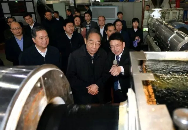 尤書記一行參觀了公司鋼骨架聚乙烯(PE)塑料復合管車間、管材檢測實驗室和企業展館。在參觀過程中,陳董事長向尤書記一行介紹了公司生產經營情況,并著重介紹了公司管材在海綿城市建設中的應用和納川新能源汽車產業情況。