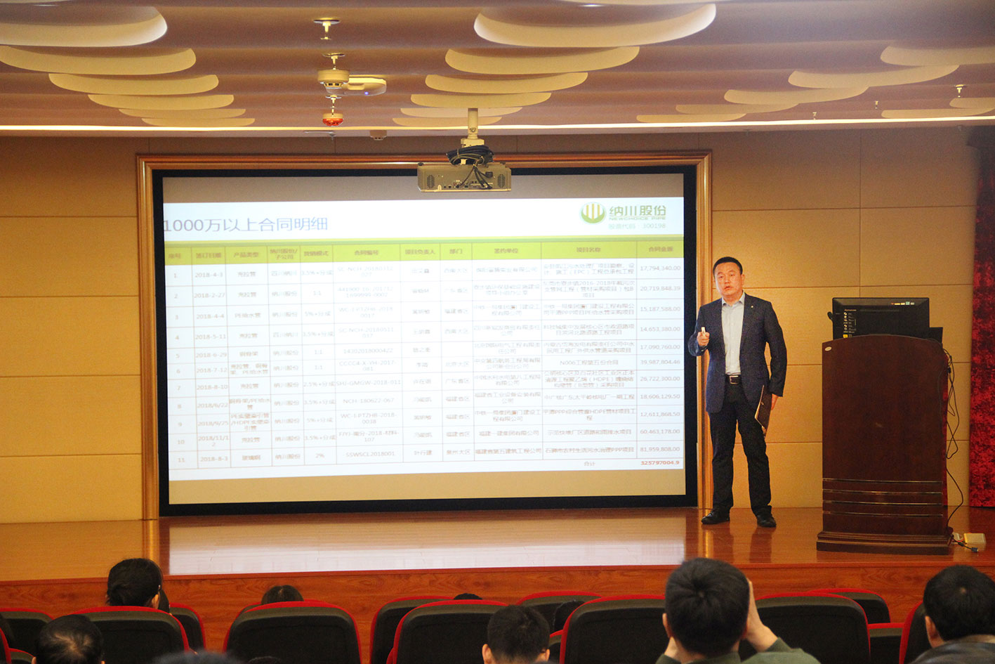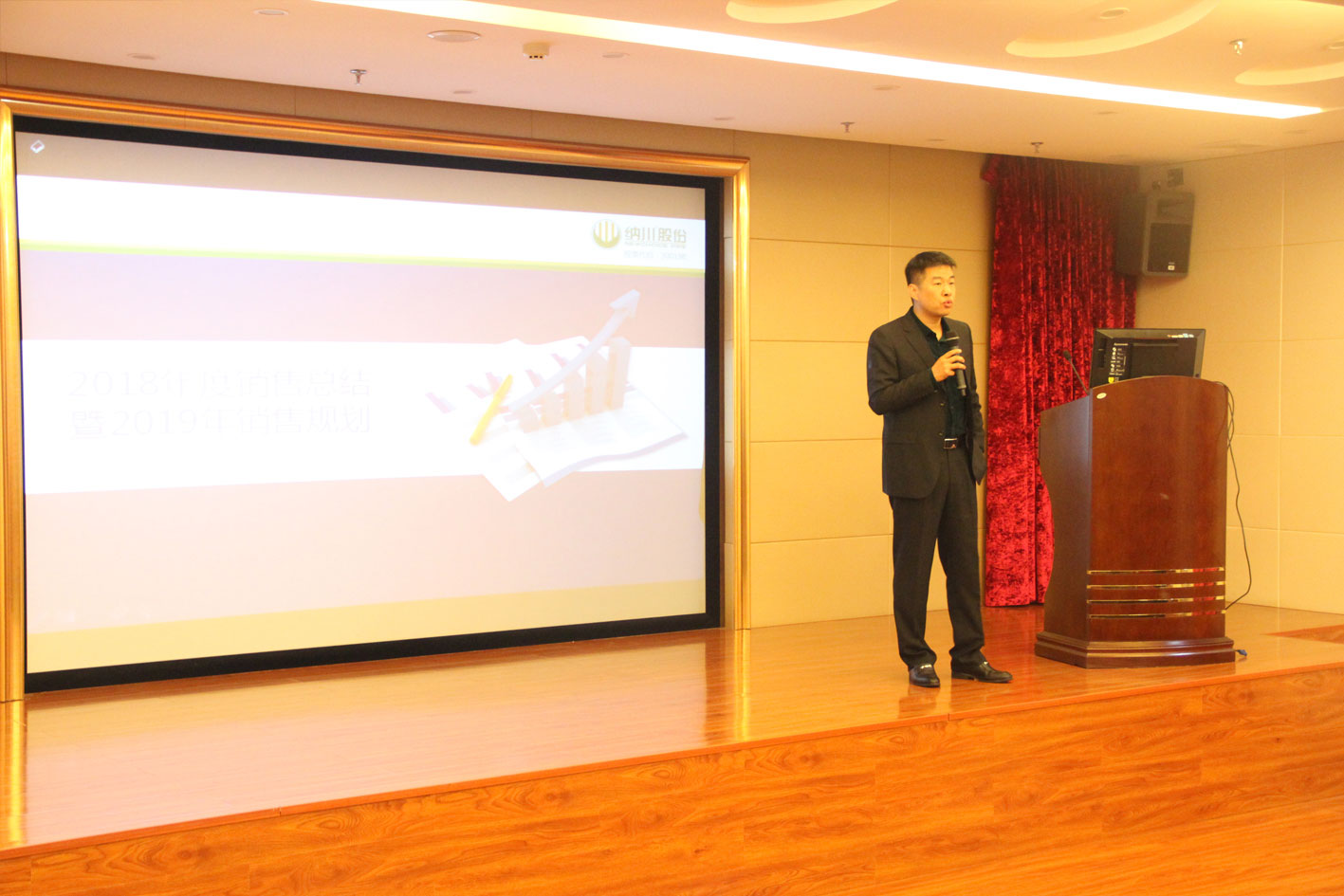 納川管業總經理林藝輝從2018年銷售情況、未來趨勢、業務要求三個方面作了講解。并對全體銷售人員的辛勤付出及全力支持表達了由衷感謝,對未來工作發展中心和方向做出要求。